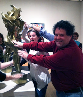 És mi történik a képen? Egyrészt prezentálva látjuk a MOMA egyik kiállításán a "pure white box" elképzelést, másrészról pedig a Mr. Orselli mások társaságában épp egy kiállított tárgyat fog meg, cérnakesztyű nélkül! Ő maga üdvözítette ezt a lehetőséget, műtárgyvédelmi szempontból azonban ez nem éppen a legjobb megoldás, hogy a tárgyat közelebb vigyük a látogatóhoz. Ki ne érezne késztetést egyszer-egyszer, hogy megérintsen egy római kori szobrot, csak hogy egy példát említsek. Kell ebben engedniük a múzeumnak, és kitörölniük a "Hozzányúlni tilos!" felszólítást a szótárukból?